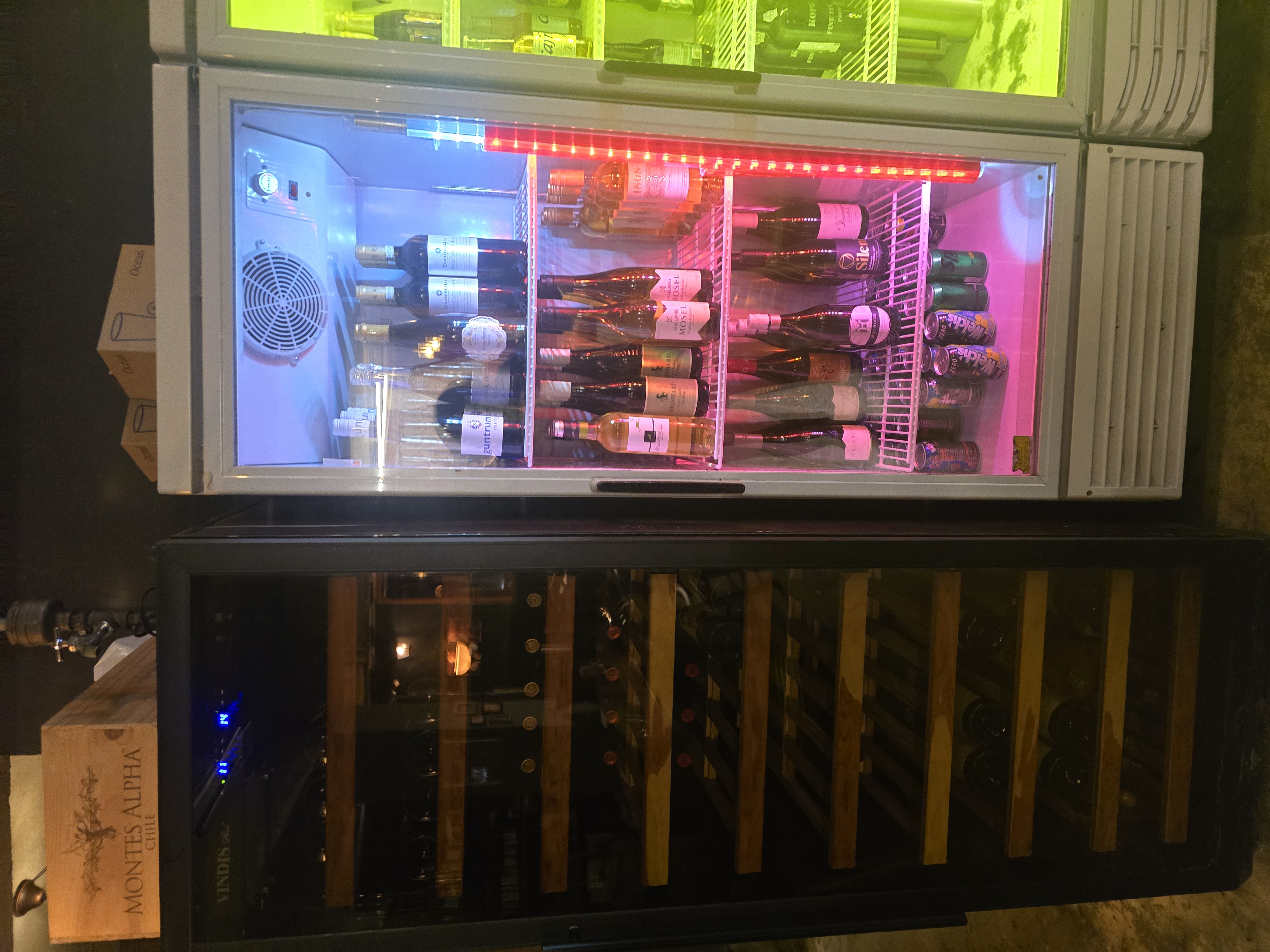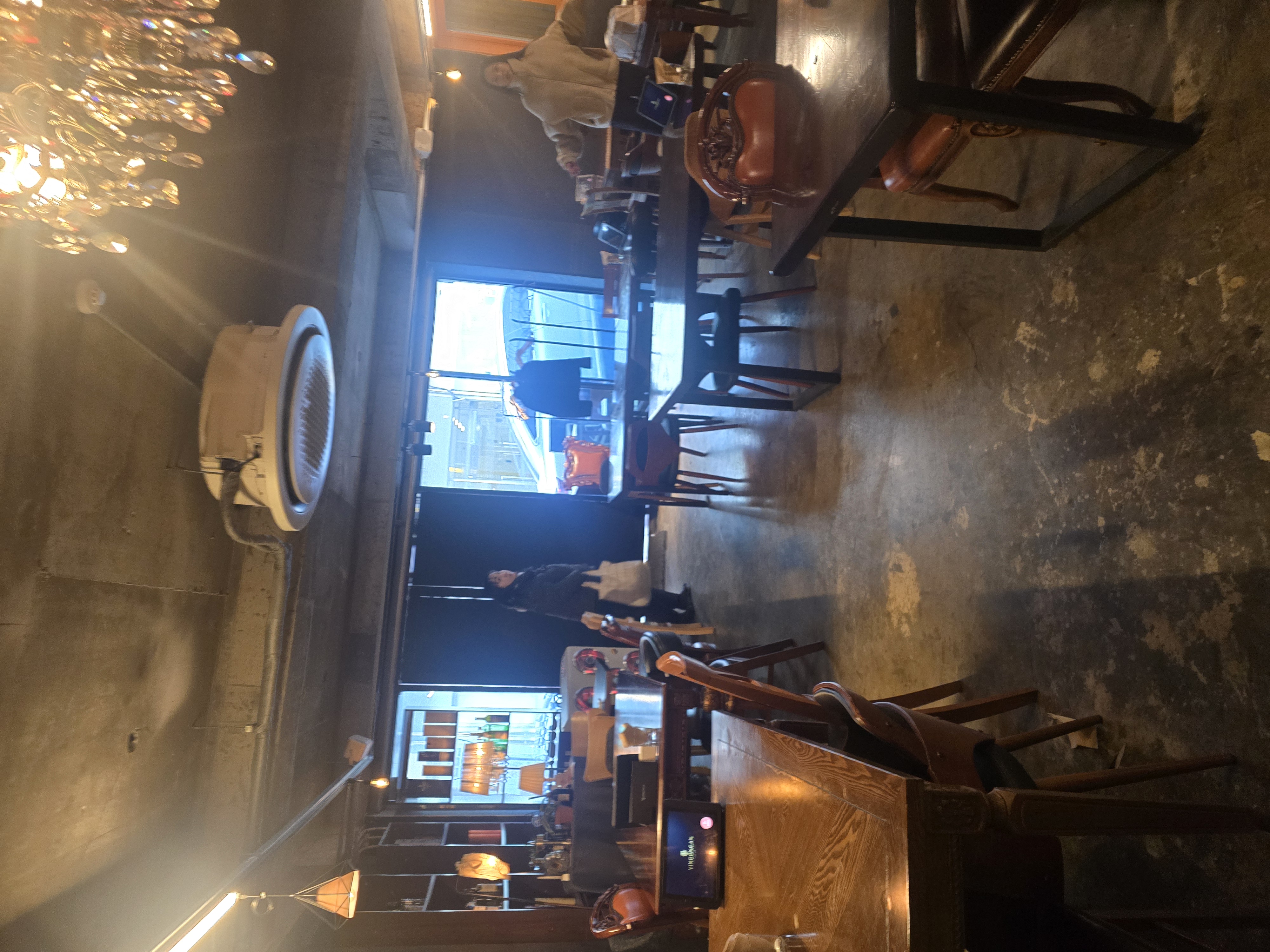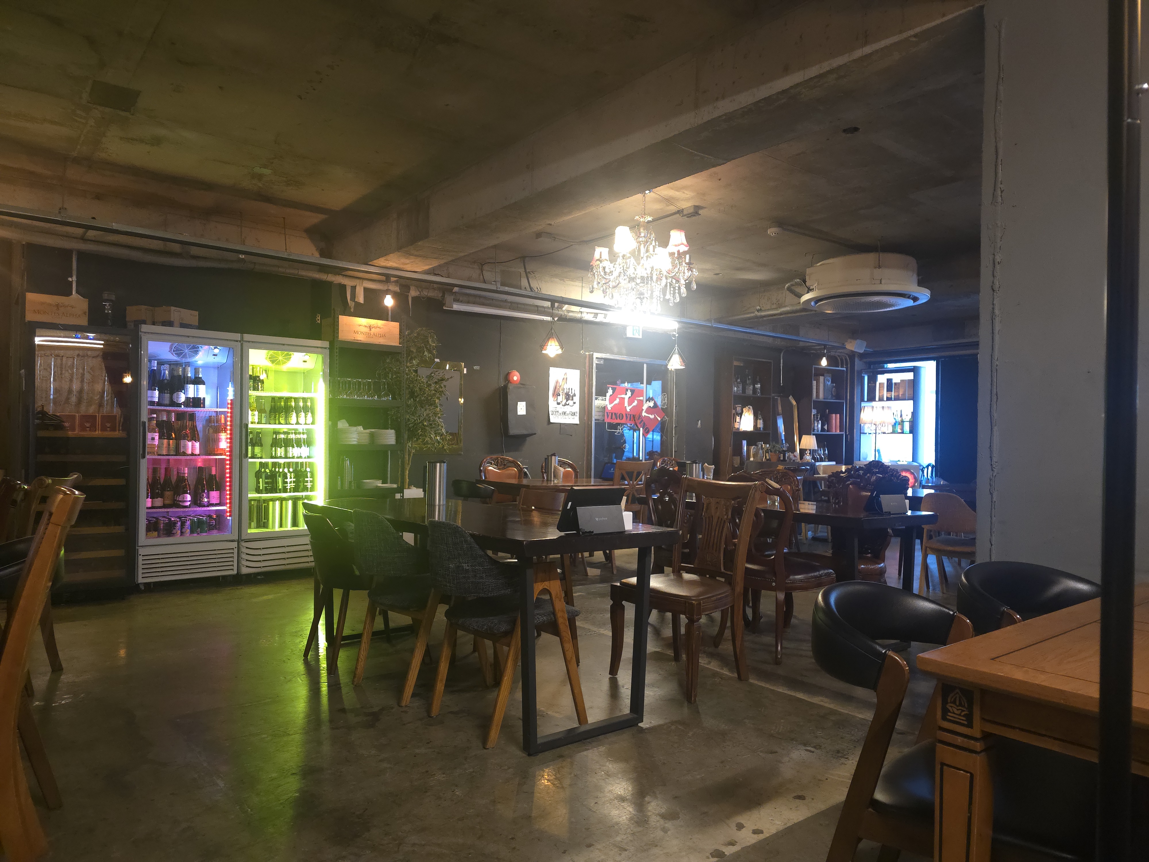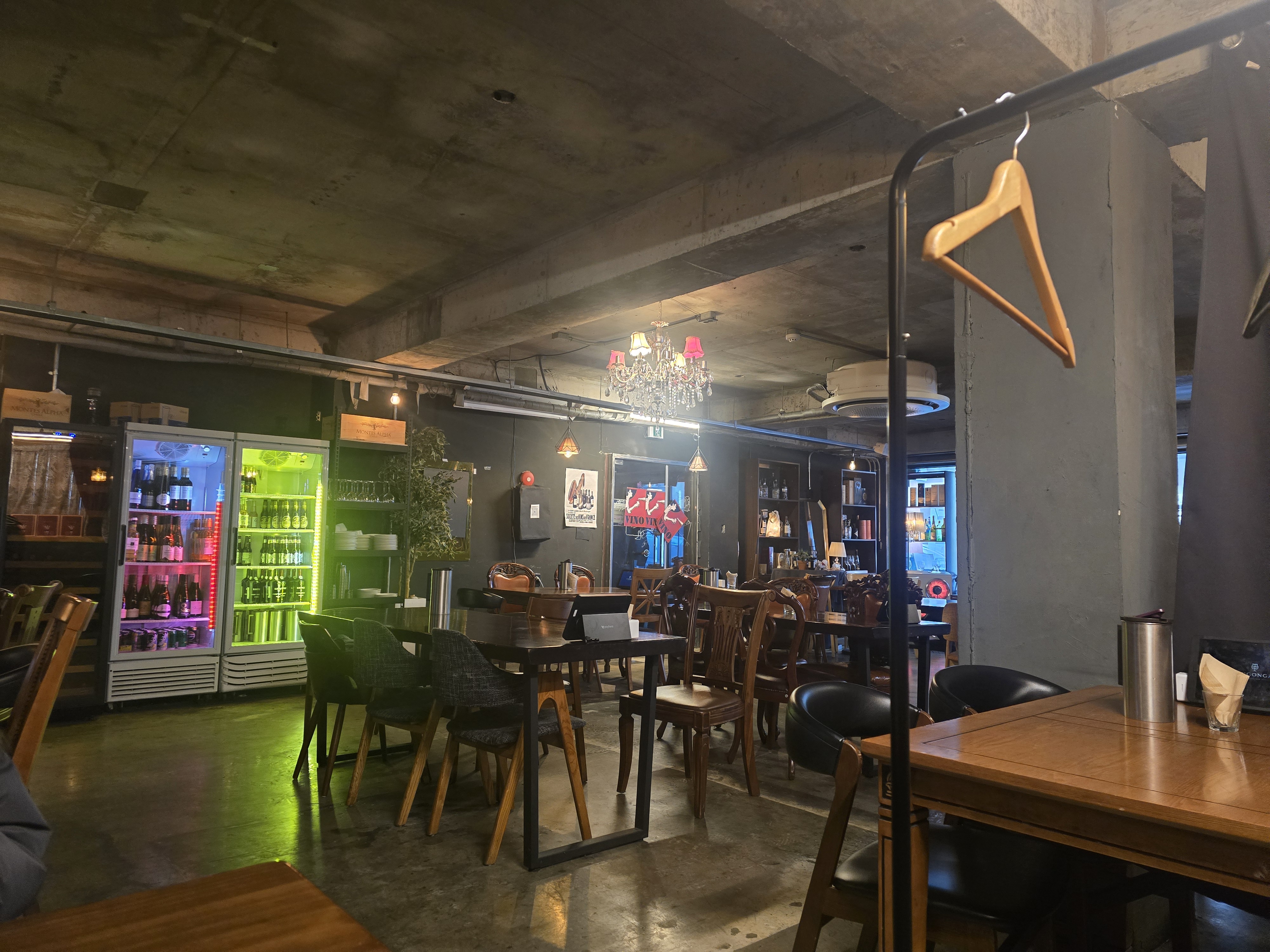 매장 내부는 노출 콘크리트 천장과 화려한 샹들리에가 어우러져 독특한 인더스트리얼 무드를 연출한다. 한쪽 벽면을 채운 와인 냉장고와 은은한 조명은 이곳이 저녁에는 위스키와 와인을 즐길 수 있는 힙한 공간으로 변모함을 암시한다.