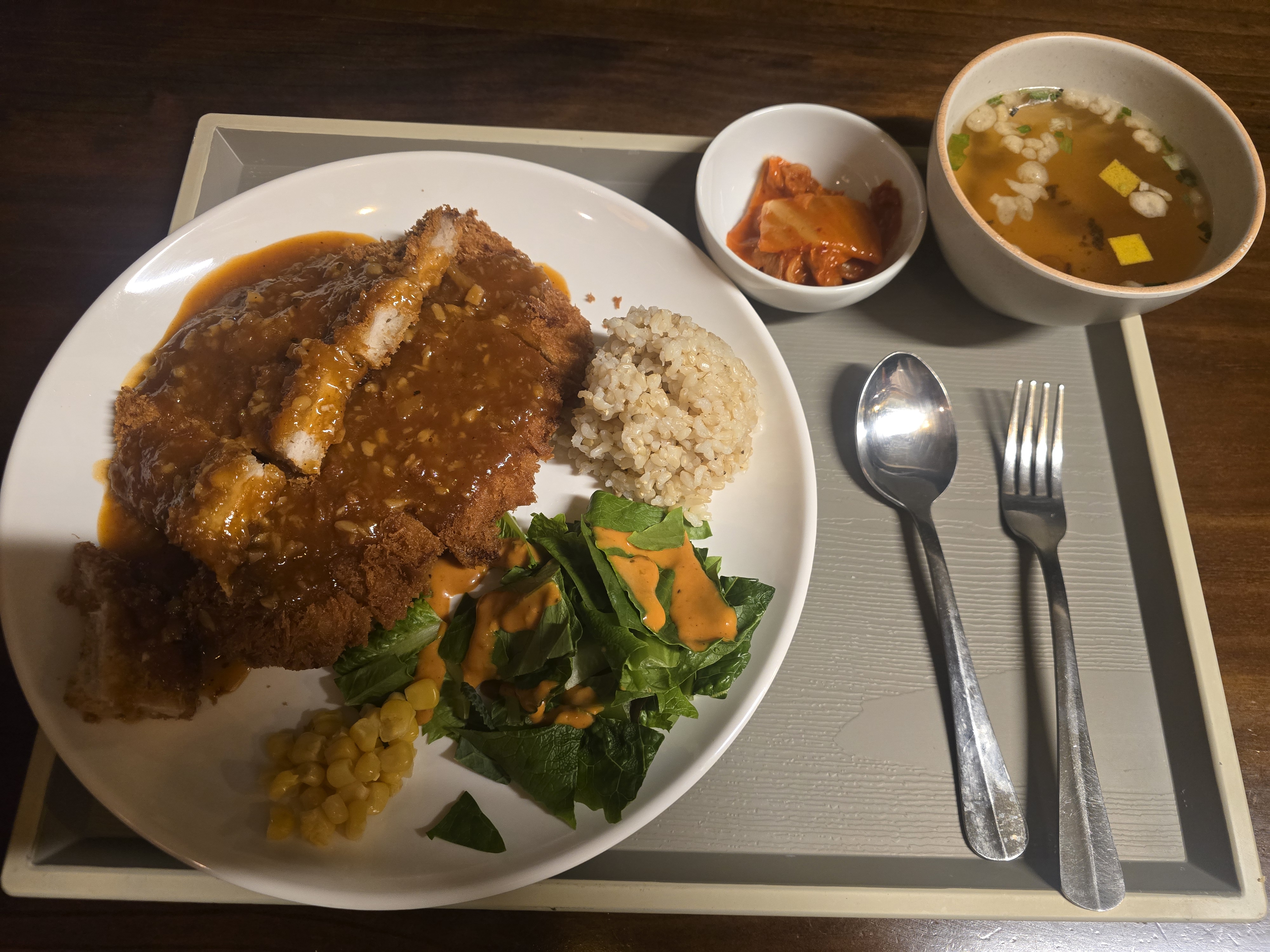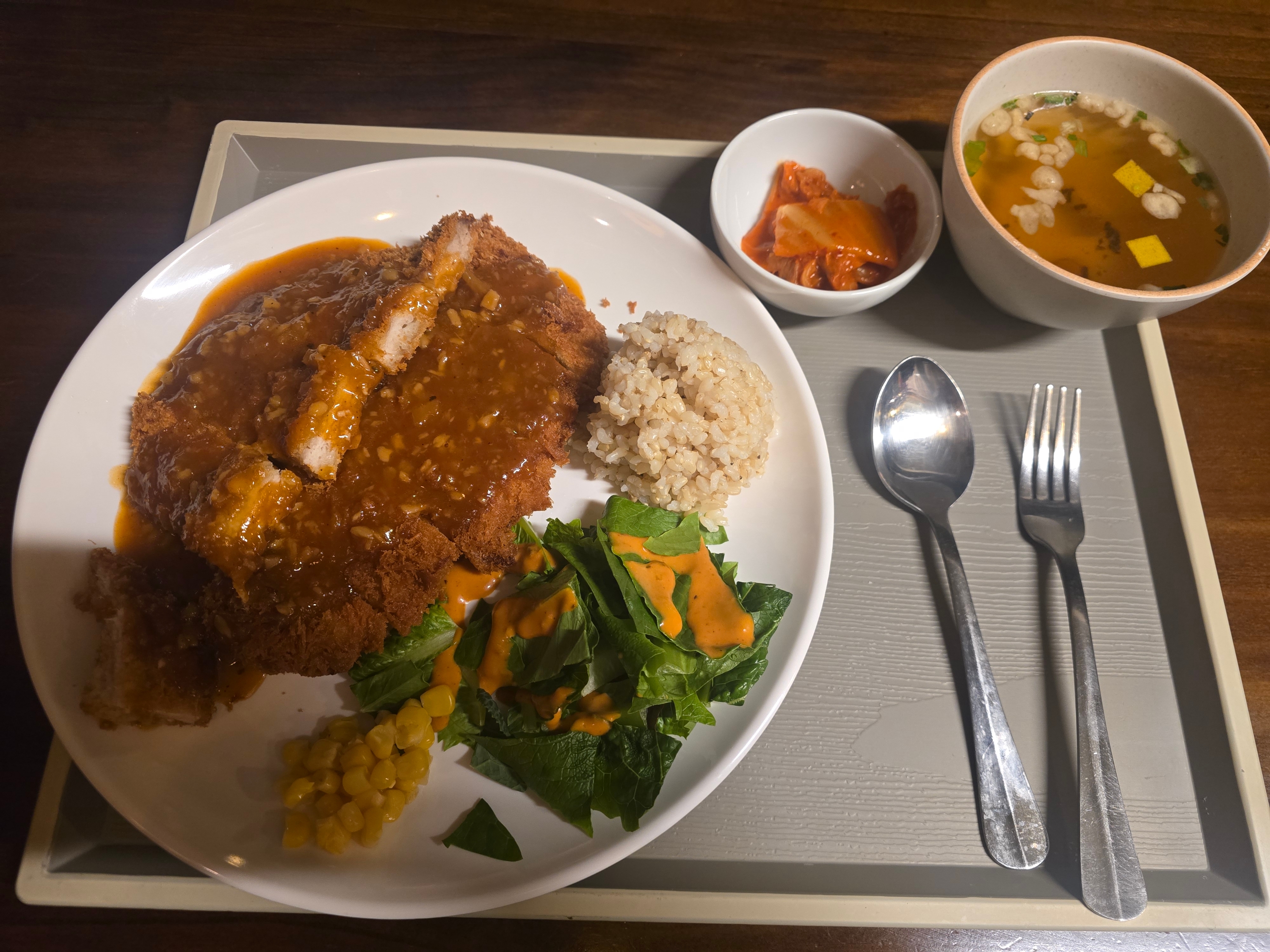 여기에 곁들여진 신선한 샐러드와 톡톡 터지는 옥수수 콘, 그리고 흰쌀밥이 아닌 흑미밥이 제공되어 건강함까지 챙겼다. 따뜻한 국물과 아삭한 김치는 자칫 느낄 할 수 있는 맛을 깔끔하게 잡아준다.